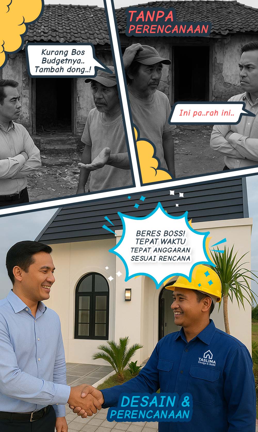 Hindari resiko terkaget-kaget sampai jantungan gara-gara over budget biaya bangunan. Serahkan pada Taslima saja.